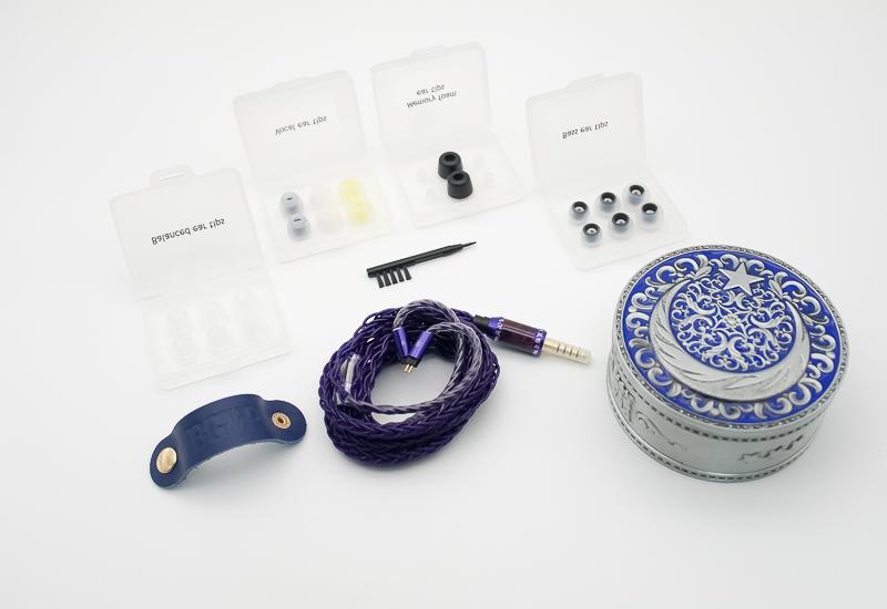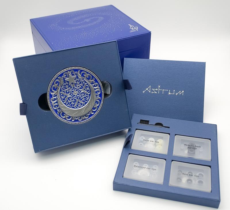 ▼ 包裝內規劃得很完整,金屬收納盒盤面採用藍銀雕花與弦月設計,製造出一種細膩工藝感。擺放的井然有序,分類收納不同用途的耳塞,提升了使用便利性。