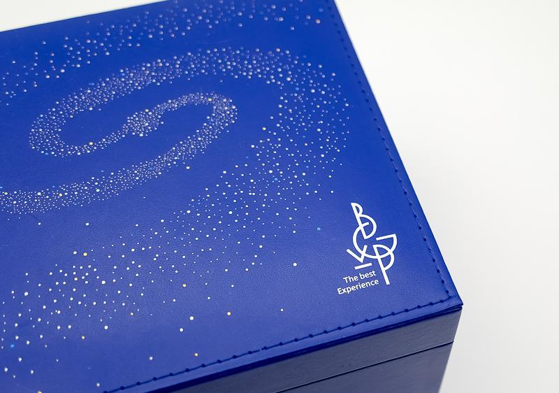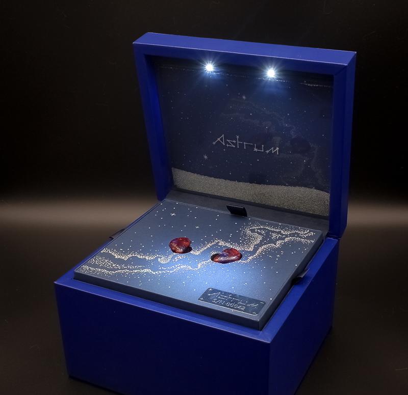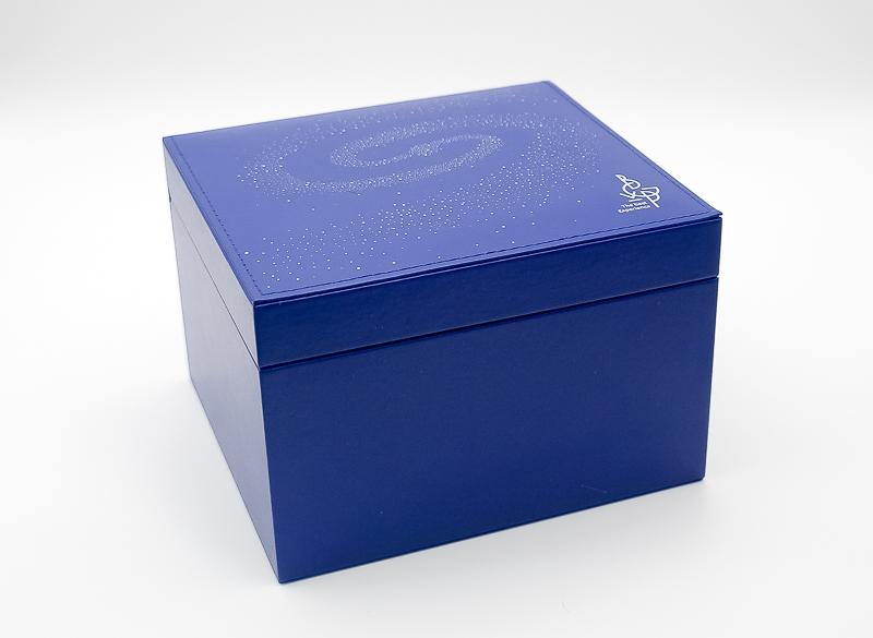▼ 掀開盒蓋,映入眼簾的是「儀式感」滿點的星空場景。兩顆LED打下去還真有點像小型天文館,就差個語音導覽。認真地說,LED燈設計在開蓋瞬間營造專屬氛圍,對追求收藏儀式感的用家而言,是一個加分亮點。耳機本體規劃在銀河紋盤座上,整齊擺放,底板有星點紋理與序號銘牌,質感流露但不會過於浮誇。