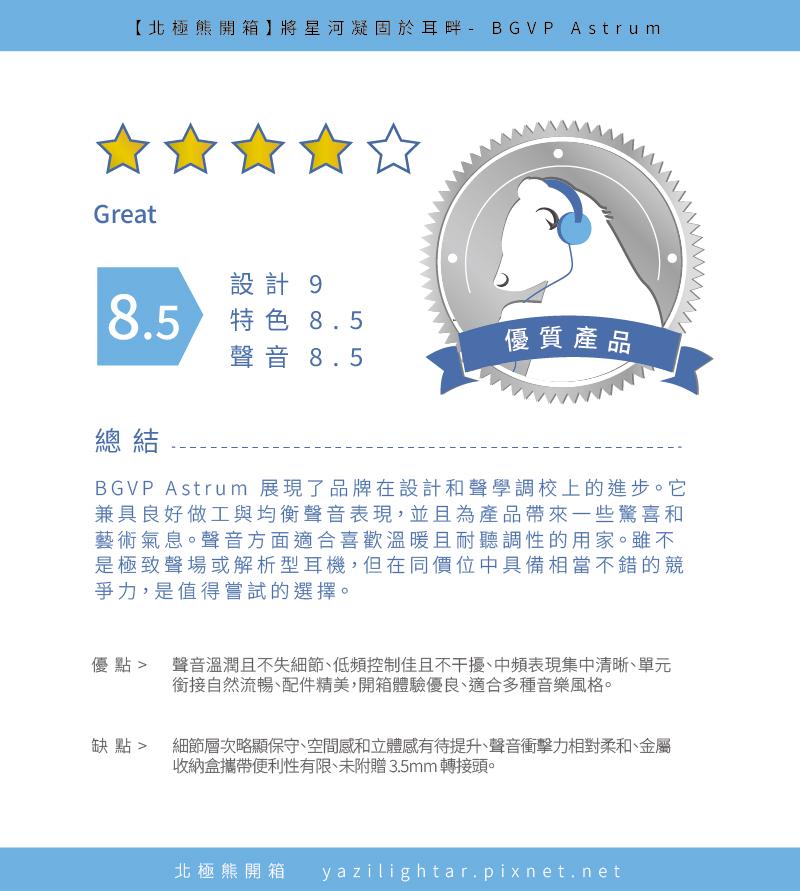 看完以上的外觀介紹,相信大家對 BGVP Astrum 的設計已有一定了解。以下是本熊整理出的 Astrum 外觀特色,供大家參考: