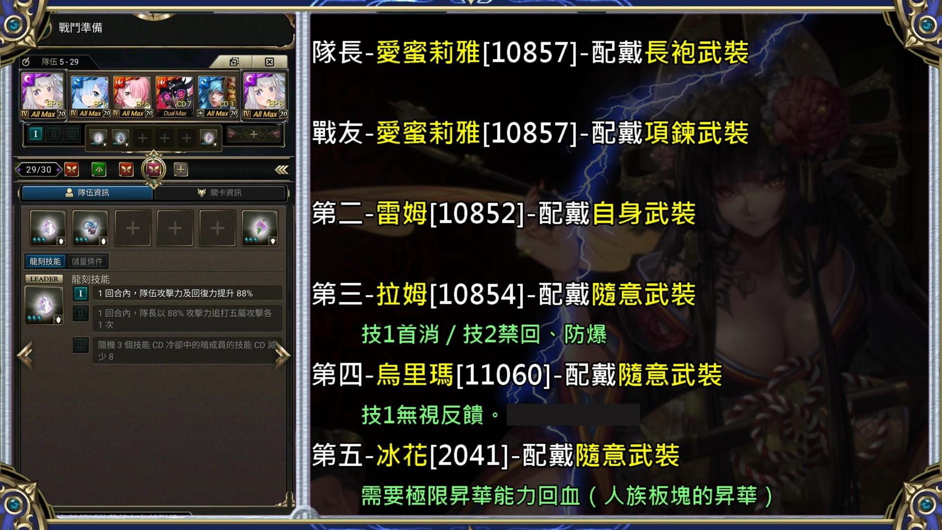 依序開雷姆變身、隊長技2、雷姆技1[水*5]、拉姆技2、最後拉姆技1,