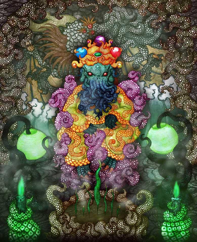 按照以上的主題來發想,形象上就非常直接的將克蘇魯呈現成一尊台灣廟宇中常見傳統形象的一身金絲蟒袍高冠雜亂髯鬚的神像了