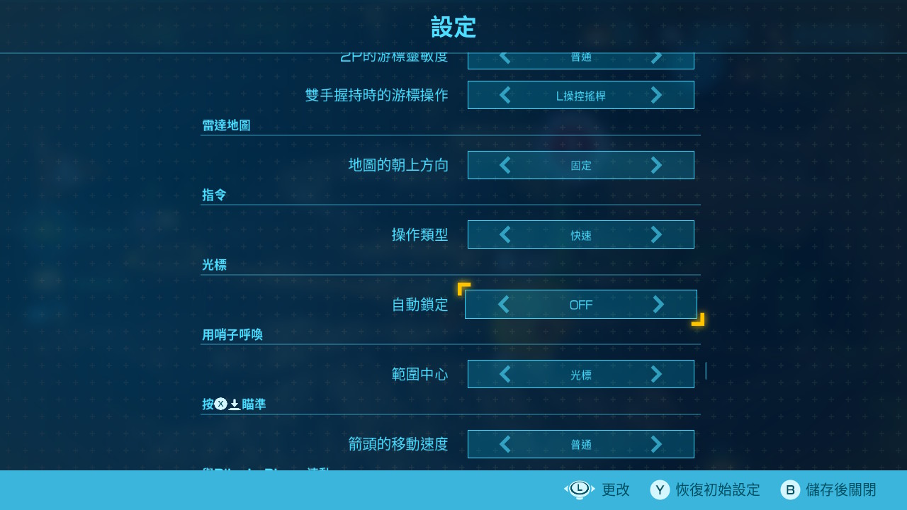 終於可以關掉自動鎖定。先前我對四代最大怨念就是自動鎖定,超惱人、超機巴煩的一個輔助功能,當螢幕上的怪物一多,準心就會因為自動鎖定的關係跳來跳去,根本沒辦法細微操作皮克敏。這次官方總算默默的加入開關,給玩家一個彈性。關掉選項之後,跟三代一樣,當附近有可瞄準的物體時,按下 ZR 才會鎖定。
