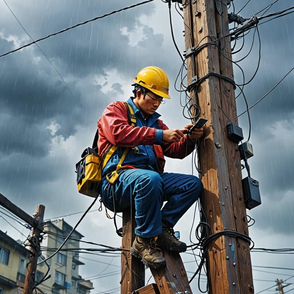 倪鈿立揹著工具爬上電線桿,冒著雨將斷掉的電線接好。