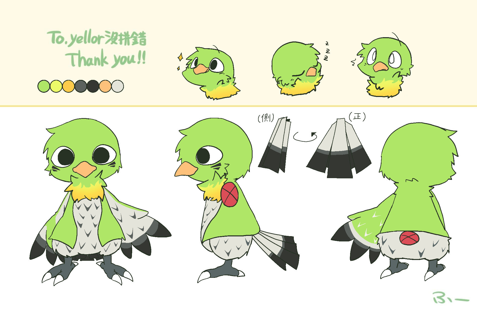 這次下了很大的決心,把我的獸設做大幅度的修改。前一個版本因為想淡化「天然鳥(Xatu)」的元素,我隨便加了一些沒有理由就加上的花紋,但效果幾乎沒有差,感覺有加跟沒加差不多,最後只是讓整體看起來更雜亂。所以我做了大膽的決定:把身體正面的顏色改成類似綠繡眼的白(灰)色,這樣應該會好多了。