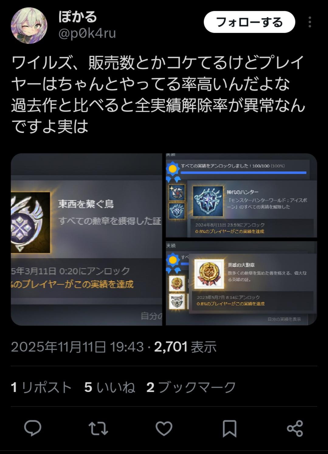 ただやってるだけで楽しいモンハンは寧ろ勲章埋めしなかったわ