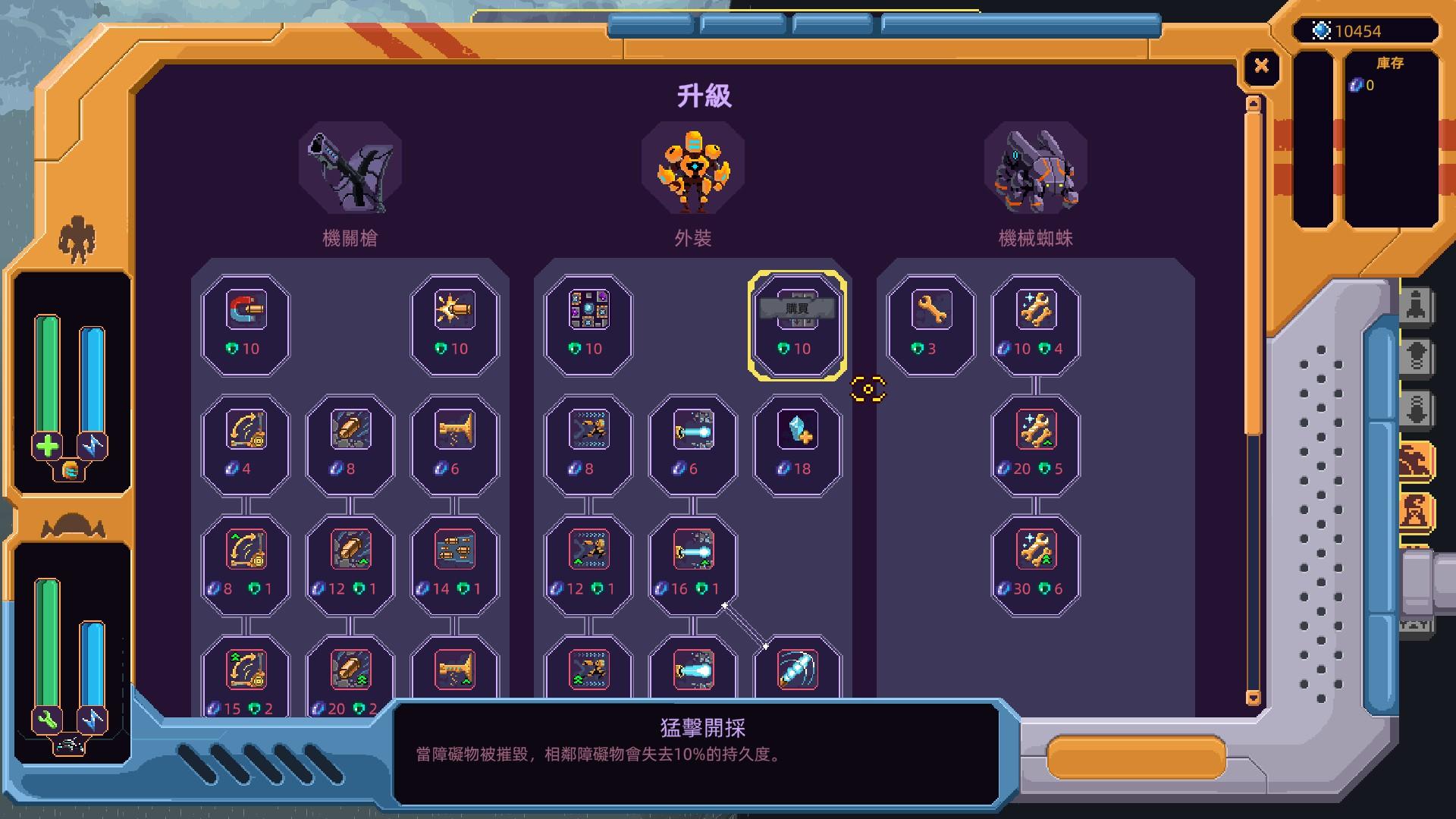 3. 特殊礦產:可以帶回基地,進行全局其他升級。每張地圖不同,而在單局中可以有很關鍵性的功能,像是機關槍可以雙倍爆擊、外裝可以猛擊開採(擴散挖掘傷害)等。