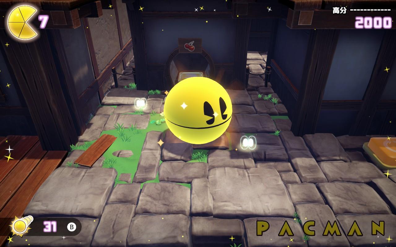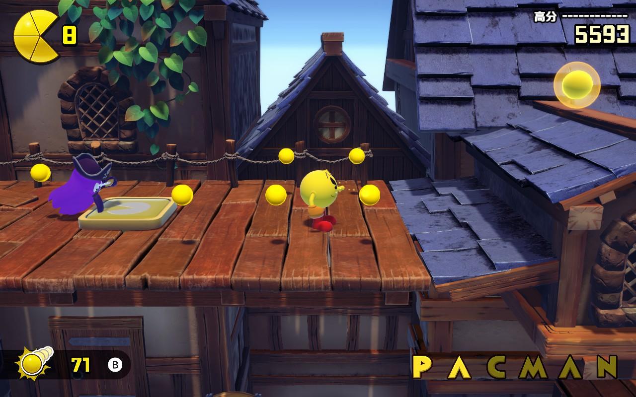 - 壓制:類似於索尼克系列中的 Stomp,PAC-MAN 可以在空中往下重壓來打倒敵人,操作方式是空中按下跳躍鍵。由於我玩太多近期的索尼克遊戲,經常不自覺地將兩下跳躍鍵當成是兩段跳,導致誤掉入一些坑,需要花點時間適應這種操作。