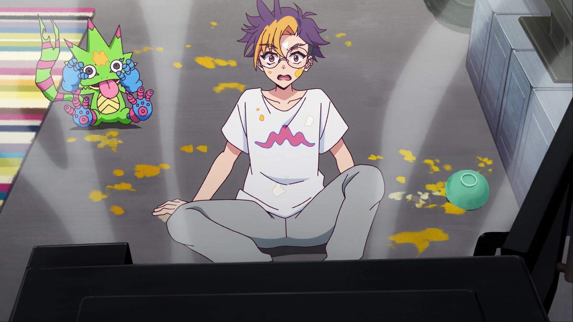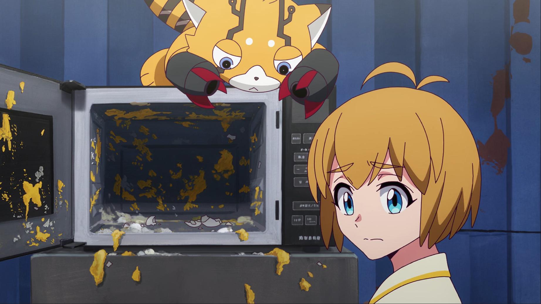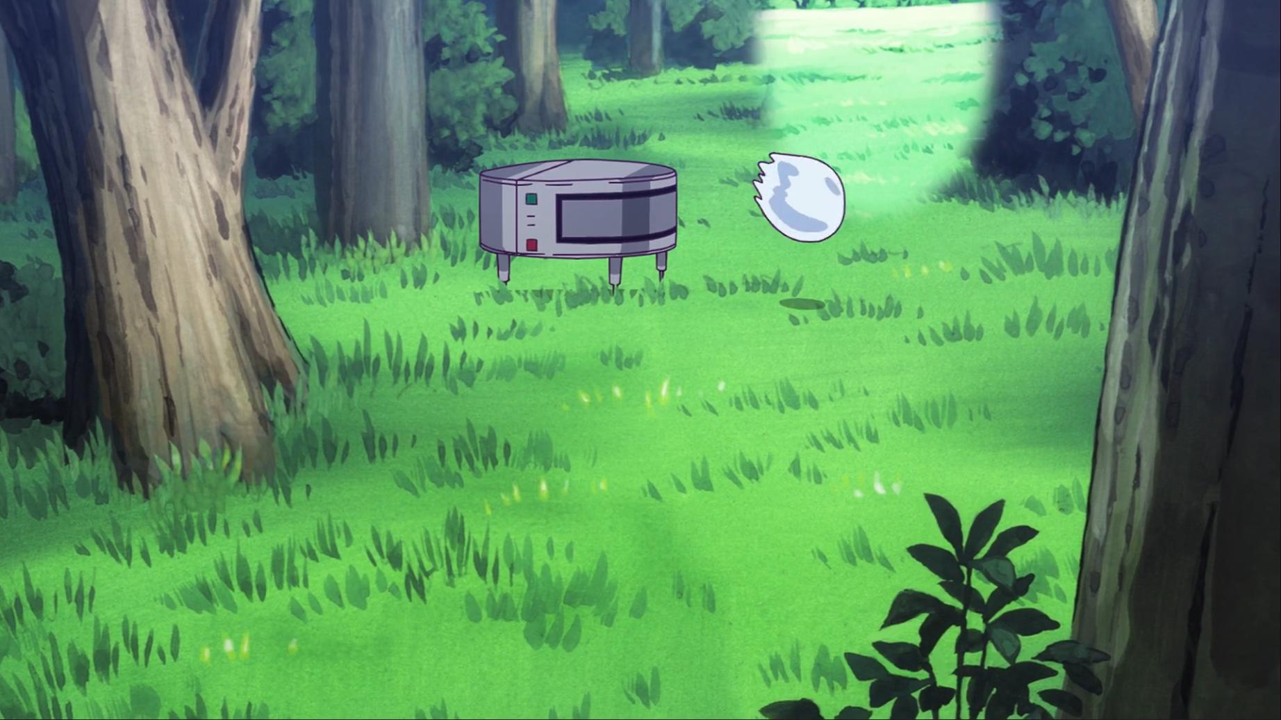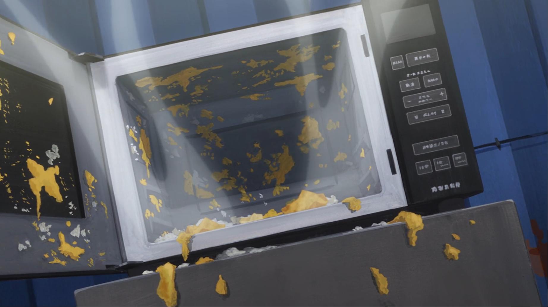 蕾娜和小誠以及剛來的小歌小心等人前來查看 原來是智郎把一整顆雞蛋放進微波爐想要加熱卻不小心爆炸