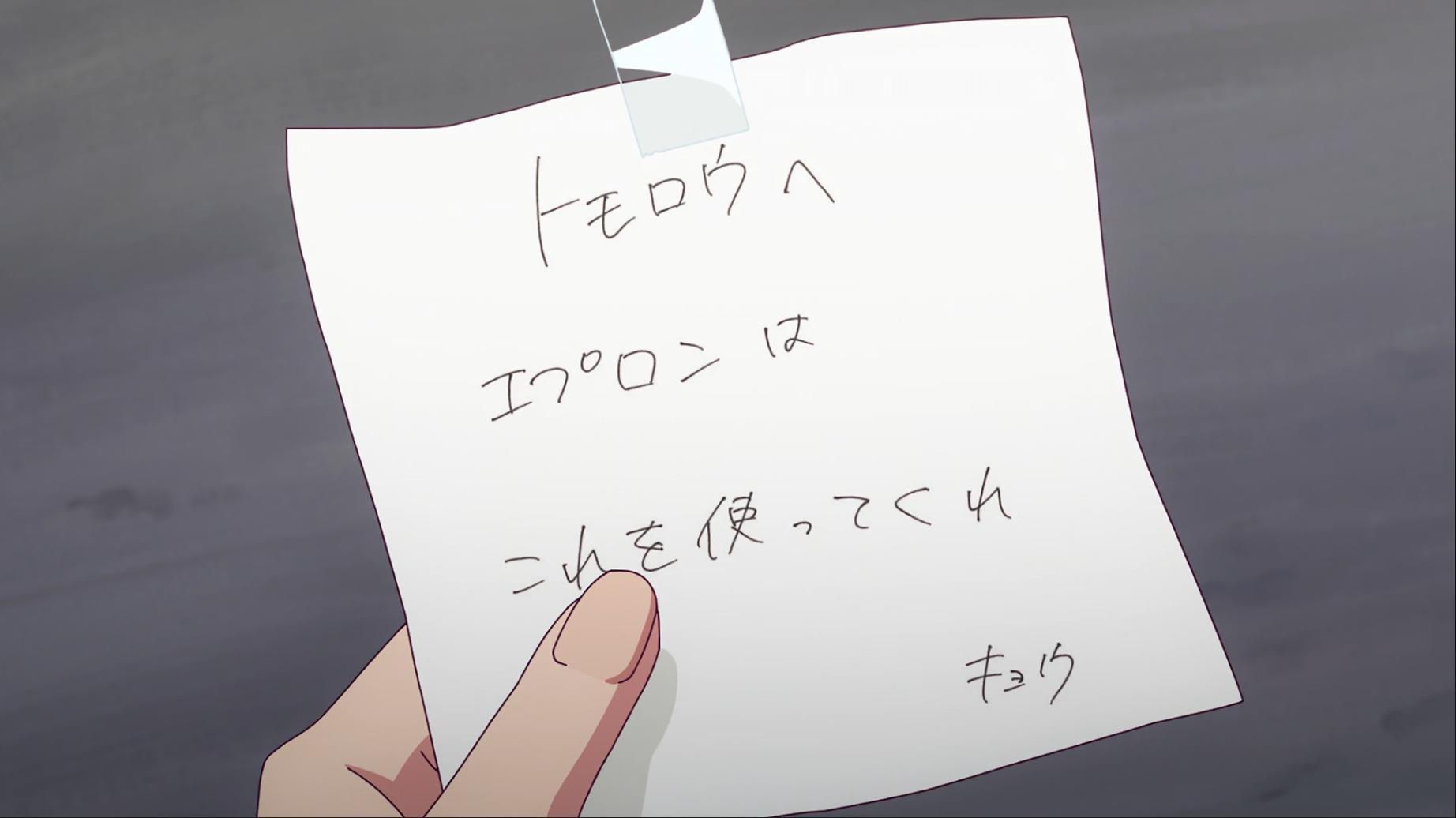 小歌發現貼在圍裙上的字條掉了原來是京寫的上面說他和奈奈兩人有事先出門先請智郎和小歌幫忙煮飯~