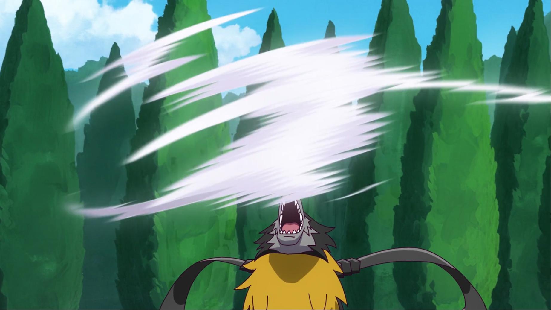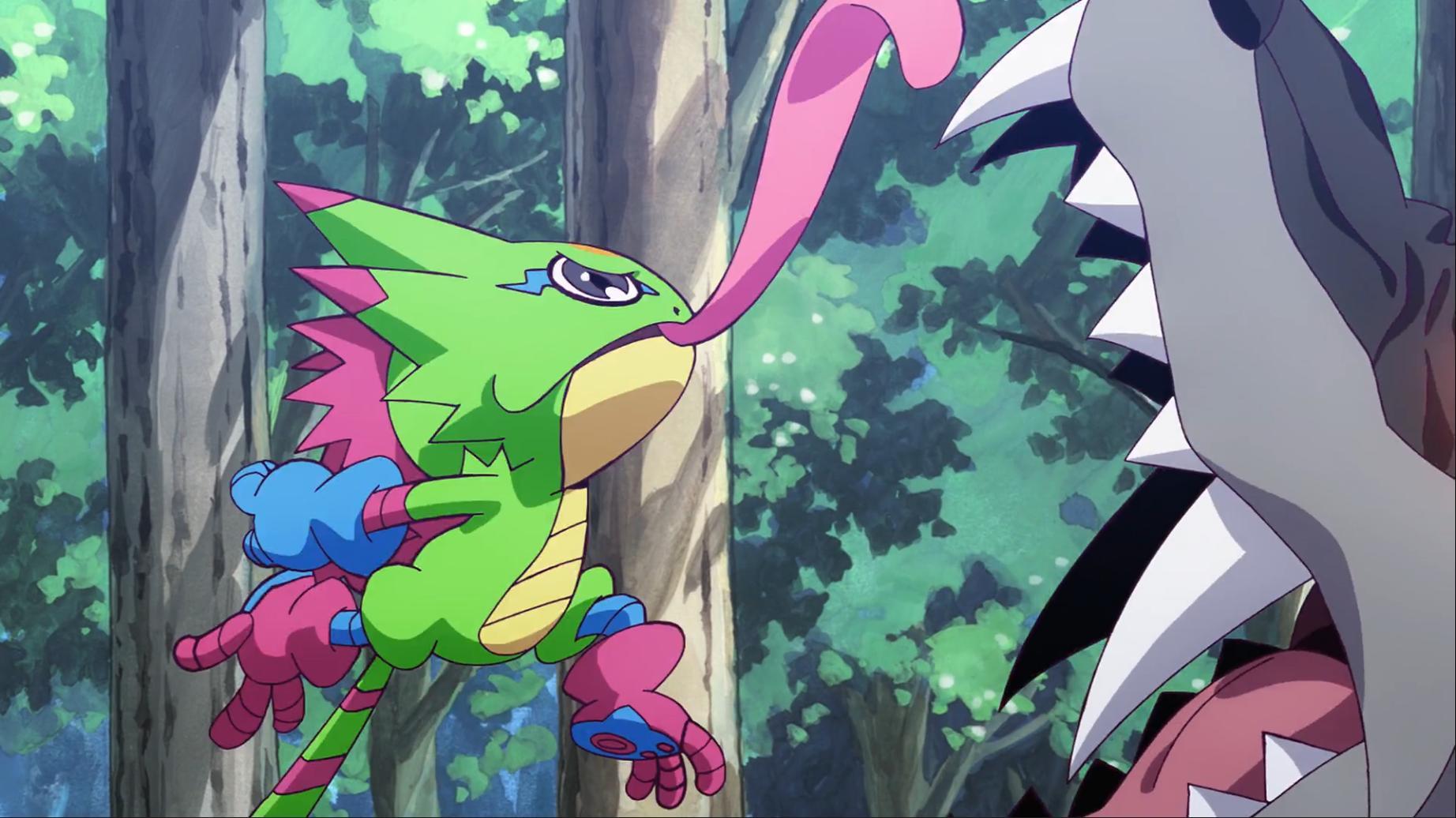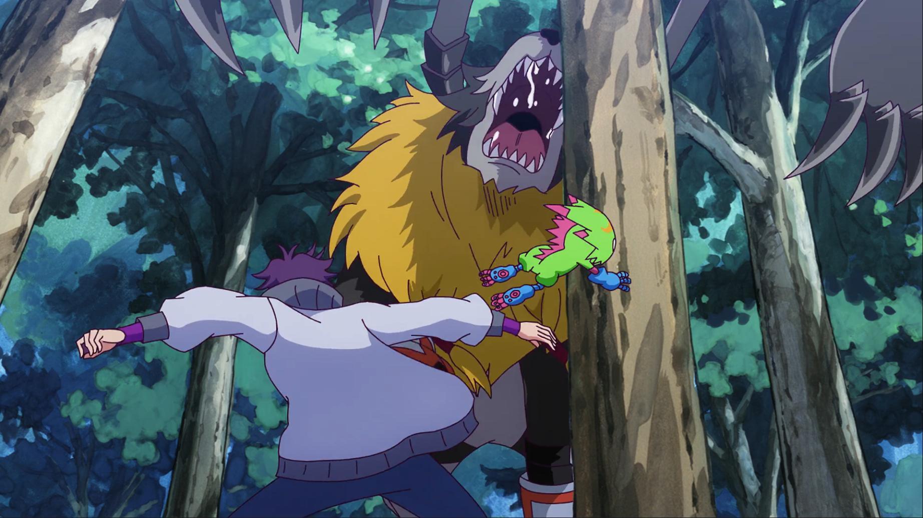 誰知才剛說完兇惡數碼獸突然從森林裡冒出來襲擊智郎和小歌 幸好壁虎獸及時用長舌頭把智郎和小歌救走 襲擊智郎和小歌等人的數碼獸是黑迦奧加獸 然而智郎和小歌兩人注意到黑迦奧加獸的表情好像很痛苦...