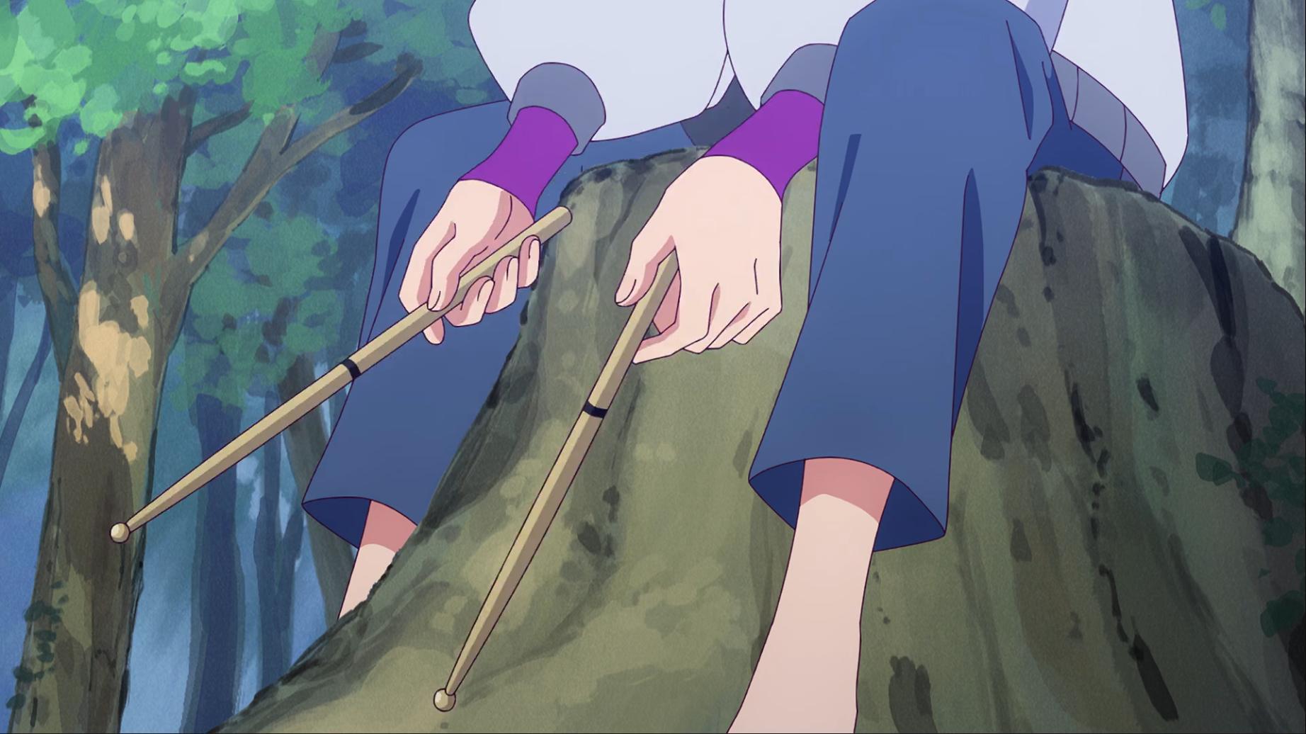 另一邊空牙獸拿礦泉水給京和奈奈補充養分 奈奈補眠後已經有比較好多可以起來了 於是奈奈先和空牙獸一起去找智郎和小歌他們 這時的智郎正在用鼓棒敲打樹樁 小歌則是稍微清清喉嚨進行一下輕唱練習~
