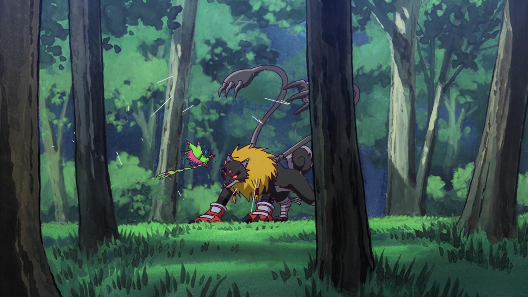 這時月光壁虎獸聞到京和奈奈的E脈衝味道後開始往道路旁邊的山上走 吉村對智郎和小歌說這裡交給他們處理 智郎和小歌先跟上去 兜帽蝠獸和普莉露梅洛倫剛好注意到路上有三道巨大的爪痕...