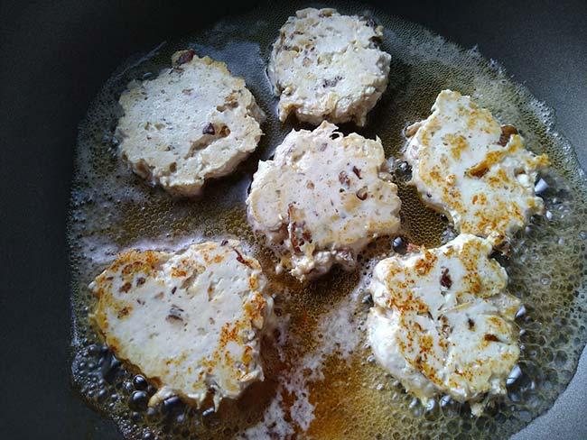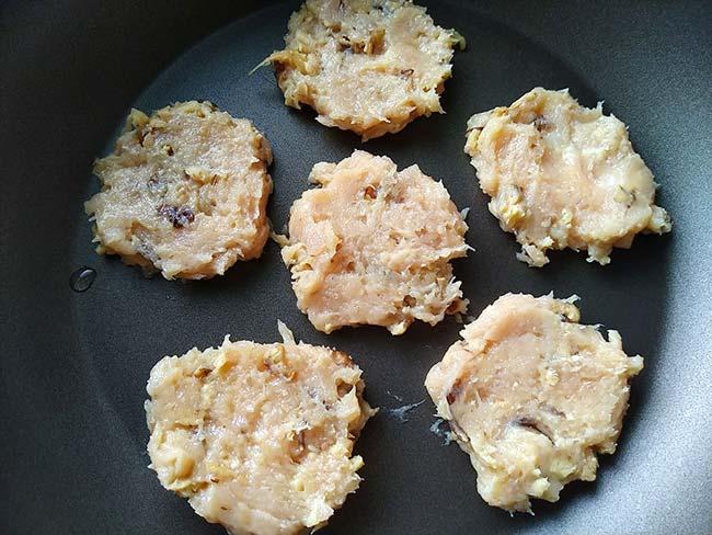 3.將肉餡分成6份,用湯匙舀入不沾平底鍋中,用湯匙背壓成餅狀,蓋上鍋蓋煎至變色