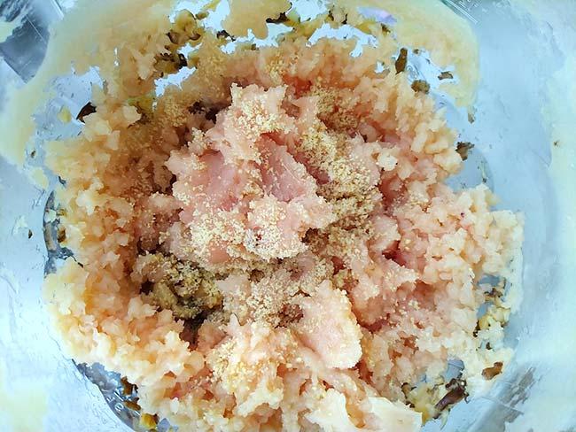 2.乾香菇泡水泡開,與雞里肌一起用調理機絞碎,加入腰果粉、柚肉和風醬拌勻