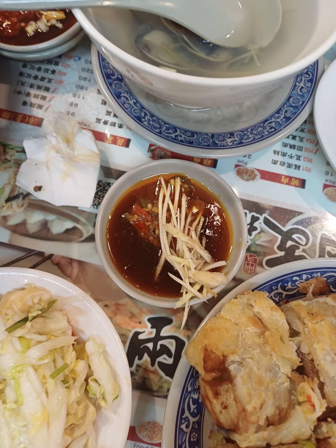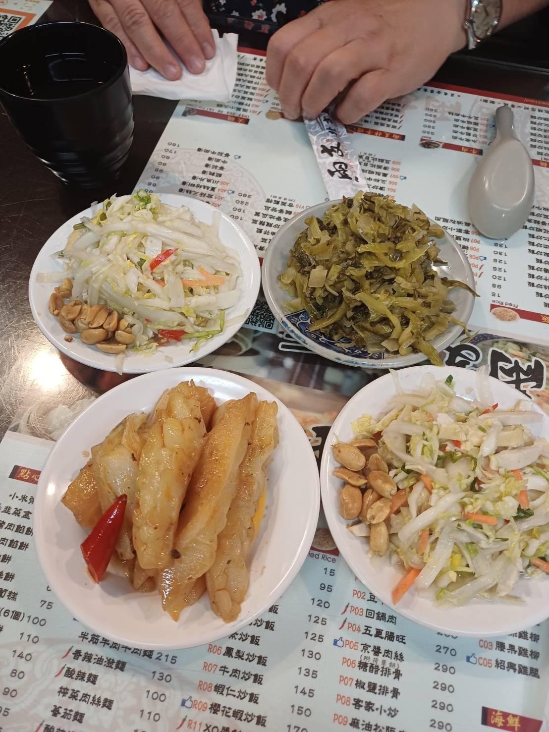 五道小菜其中有一道重覆算四種小菜,其中酸菜我加入牛肉麵去做品嘗,其他幾道則單獨吃,調味以醬油、薑絲、辣椒醬、砂糖等幾種去調醬,用途配在小菜、餃子、燒賣做沾醬用。