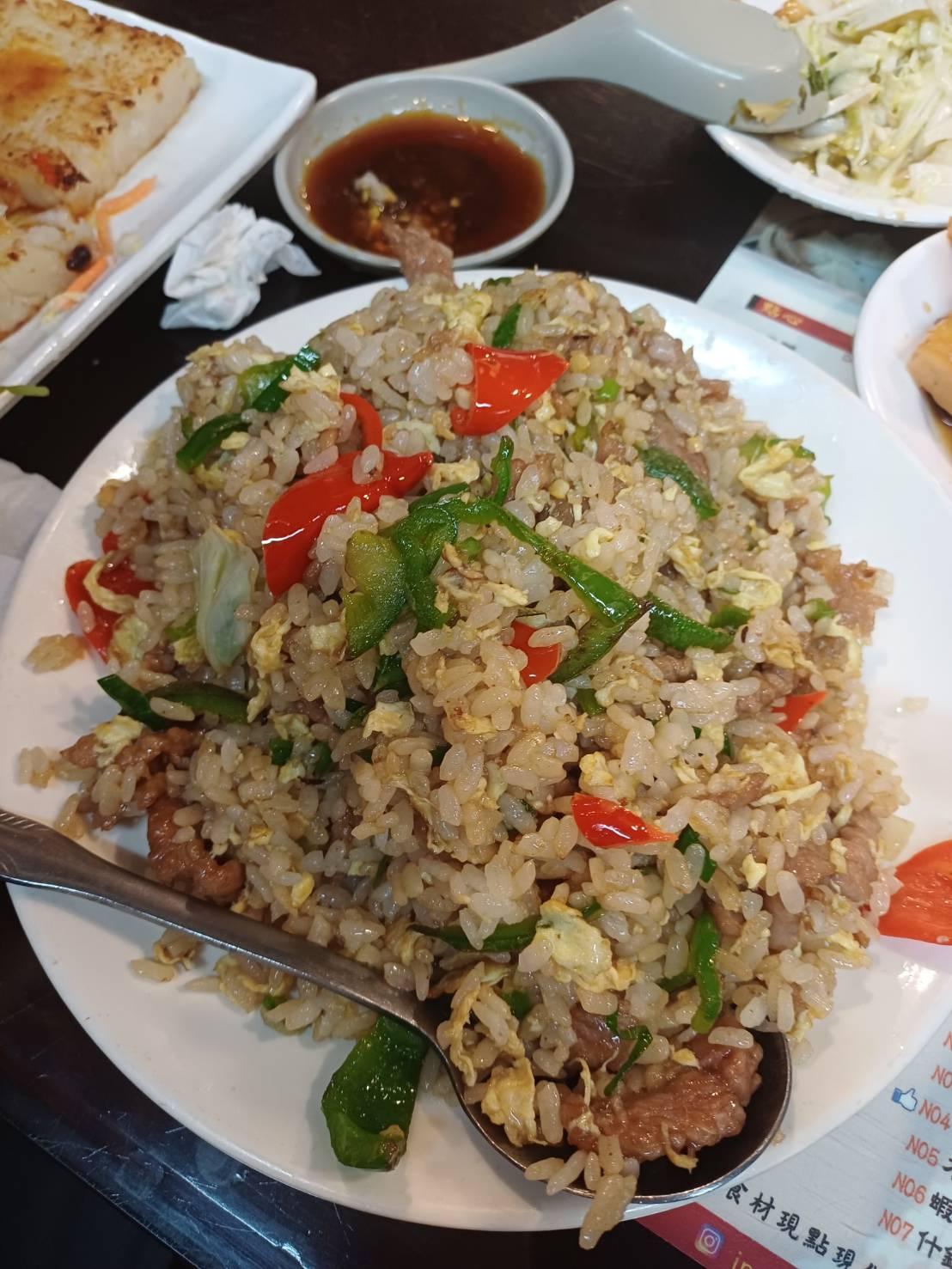 含青椒、辣椒、肉小、雞蛋、白飯等料,再配調味料去拌炒的一道炒飯,份量看起來還算多。