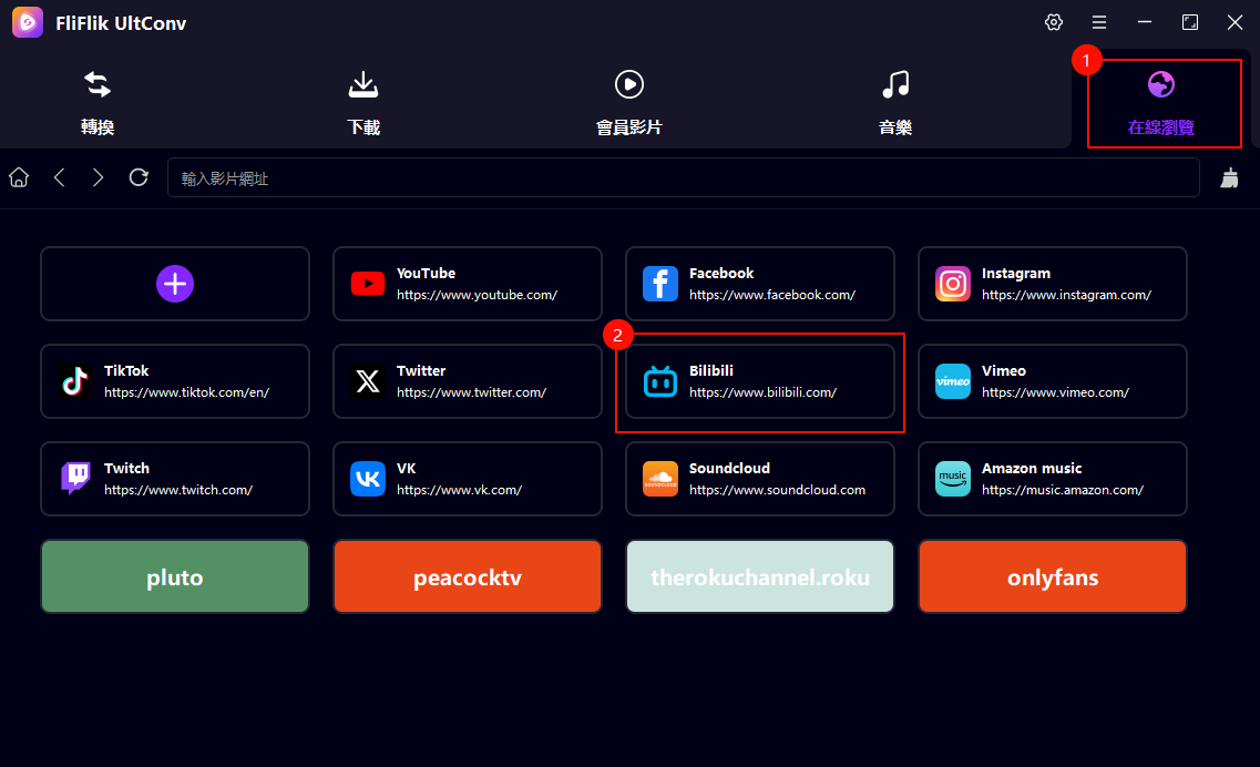 首先,下載並開啟 FliFlik UltConv 軟體。它內建了各大影音平台的專屬入口,你只要點選 「在線瀏覽」,然後找到 BiliBili 的圖標點進去,超方便!