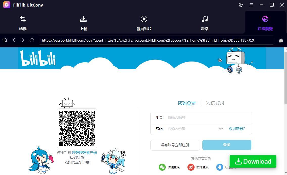 接著,在 FliFlik UltConv 的介面內,用你的 BiliBili 帳號登入。