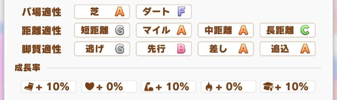 英哩和中距離的差馬或追馬,如果考量固有技,長距離維持在C就好,但是以育成中有有馬紀念,把長距離提升到B可能會比較好一些。