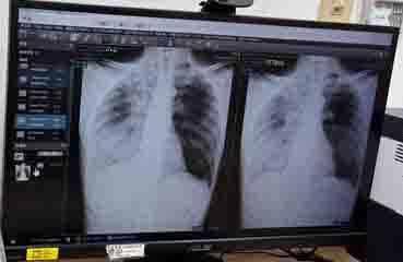 右邊快全白了,這就是肺浸潤,沒處理好可是會被一波帶走的。其實住院要拍到這個很難,那是要剛好主治醫師出現在護理站,且正在看我的X光,然後我們剛好出現被叫住,直接在護理站解釋病情。不然一般都是主治醫師去病房講解而已,就沒機會拍到了。