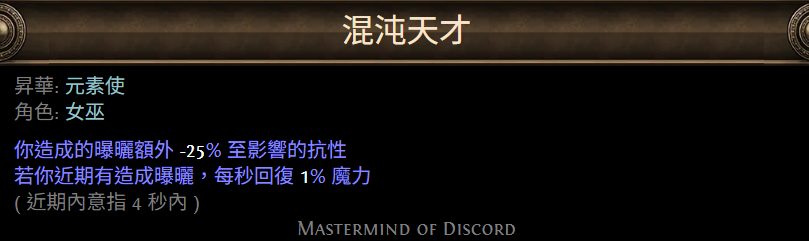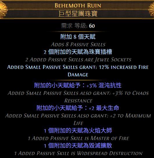 - 巨型星團(火傷):拿火焰大師(附近敵人曝曬),搭配混沌天才增加曝曬效果