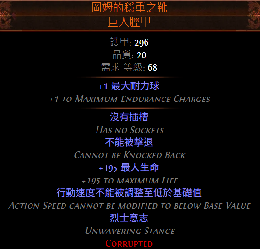 | 4300生命 88%火抗(喝紅玉藥劑)、83%冰雷抗 76%攻格 75%法格 40%承受物傷轉火傷 4顆耐力球 免暈 免冰凍 免感電 免腐血 行動速度不被調整至基礎值以下 極地裝甲(減傷) 血肉骸骨(減傷) 寒冬雕塑者(減傷) |