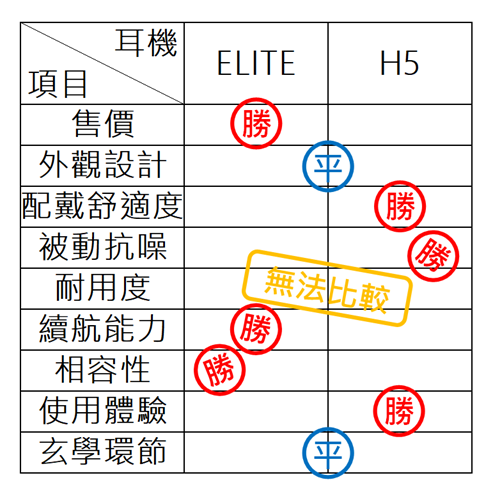 相較於ELITE,H5初期使用體驗良好,沒碰過什麼大問題。如果先不考慮使用時間長短的因素,兩者都是以初期使用來評量的話,當然是判定初期穩定度就很高的H5勝出,即然有線體驗平手,無線體驗H5小贏,那這個大項目就是後者得點了。