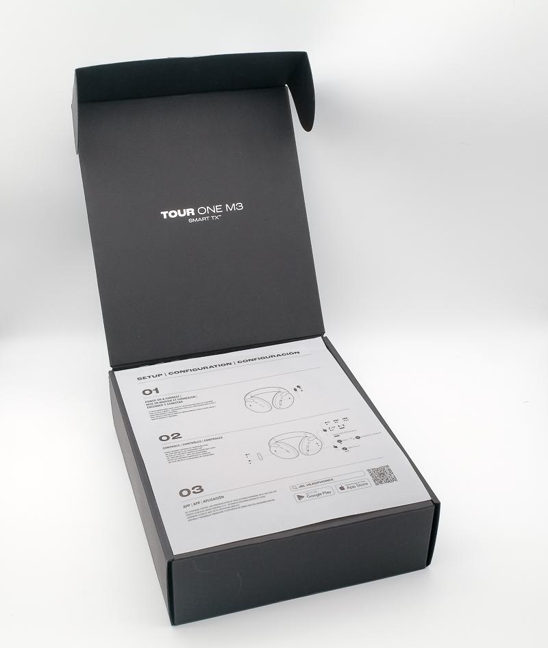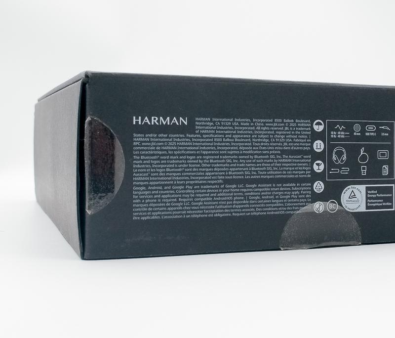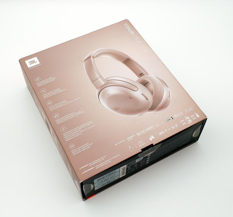 ▼ JBL Tour One M3的外包裝設計採用低調的金屬粉色主色調,正面清楚展現產品特色與主要規格,光看這包裝盒的厚度跟設計,確實有一種旗艦的氣勢。包裝背面則詳細標示品牌、產品特色及各項規格圖示,資訊一目了然。