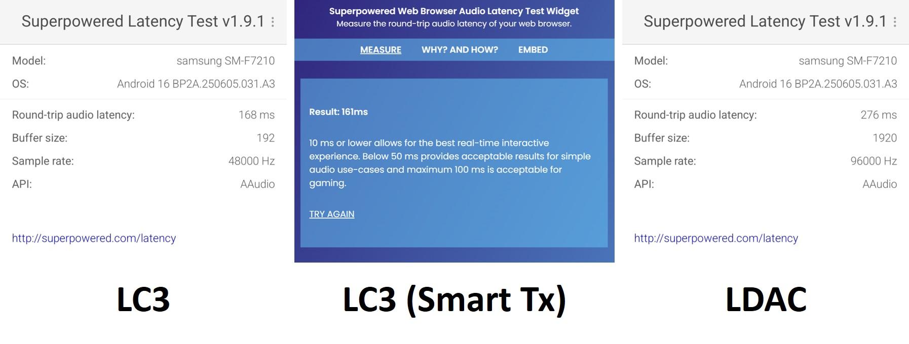 播放延遲方面,M3 使用 Smart Tx 或手機原生 LC3 編碼傳輸時,耳機本身延遲約 60ms 左右,加上播放系統延遲後保持在 160ms 附近,對多數使用情境足夠應付。使用更高傳輸量的 LDAC 時(990 kbps),延遲拉升至約 276ms,與市場上其他機型表現相近。