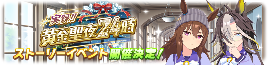 11/28 開始的新故事活動為「 實錄!!黃金聖夜 24 小時 (実録!!黄金聖夜 24 時) 」,同時開放本次活動主題『聖誕節』的新馬娘卡池 PU 角色 ★★★ 中山慶典 [祝祭遊戯]ナカヤマフェスタ 以及 ★★★ 夢之旅 [雪白の夢路]ドリームジャーニー 。