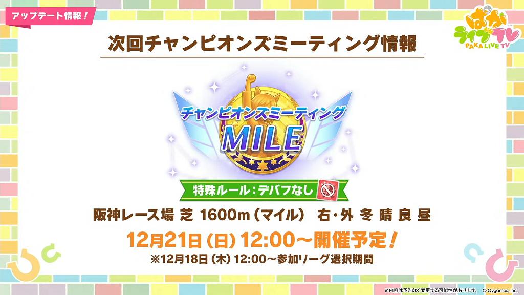12/21 預定進行冠軍集會「MILE」,1 月下旬預定進行冠軍集會「LONG」,2 月中旬預定進行群英聯賽。
