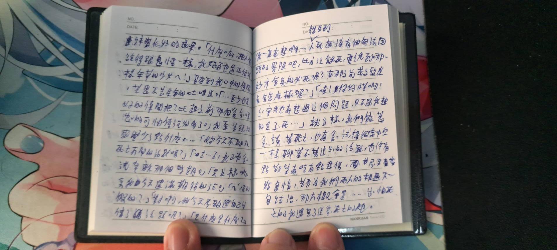 另外說一個有趣的是,我寫完後其實有幾個看到我在寫小說又無聊的同梯把這本要去看,但都第一頁就被勸退了,畢竟我字超醜又寫一堆注音,只有一個帥哥硬是解讀到了第五還第六頁,到最後要集合了才還我。老實說蠻開心的。