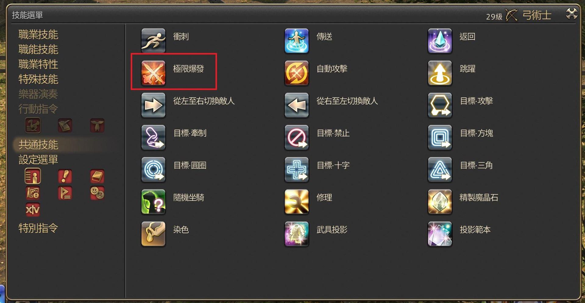 總之得先把極限爆發給拉出來,位置在技能選單→共通技能這邊。