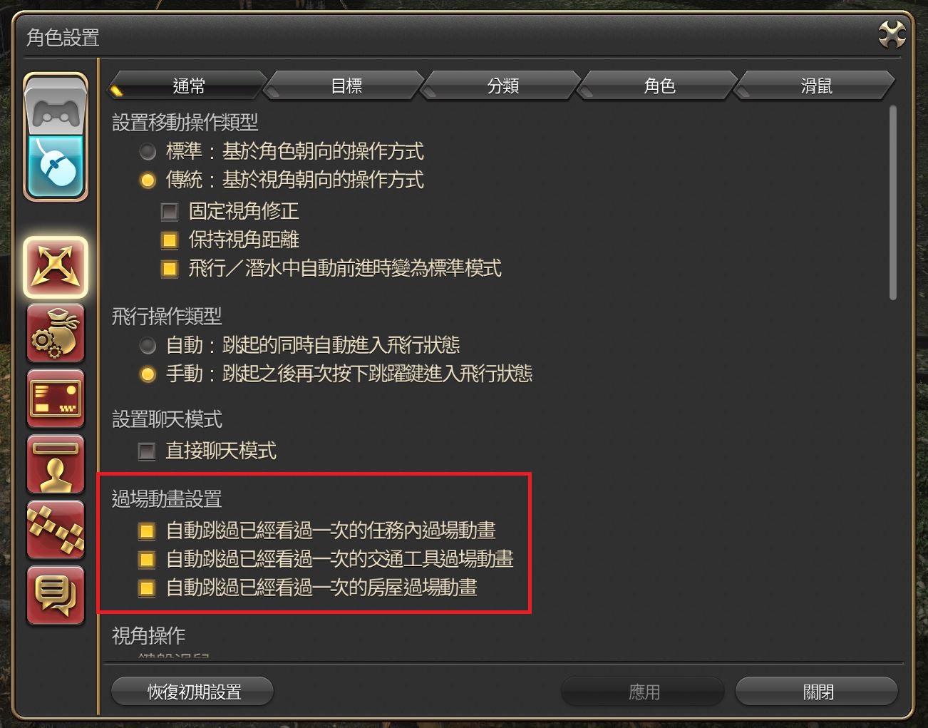 調整方式:角色設置→操作設置→通常→過場動畫設置
