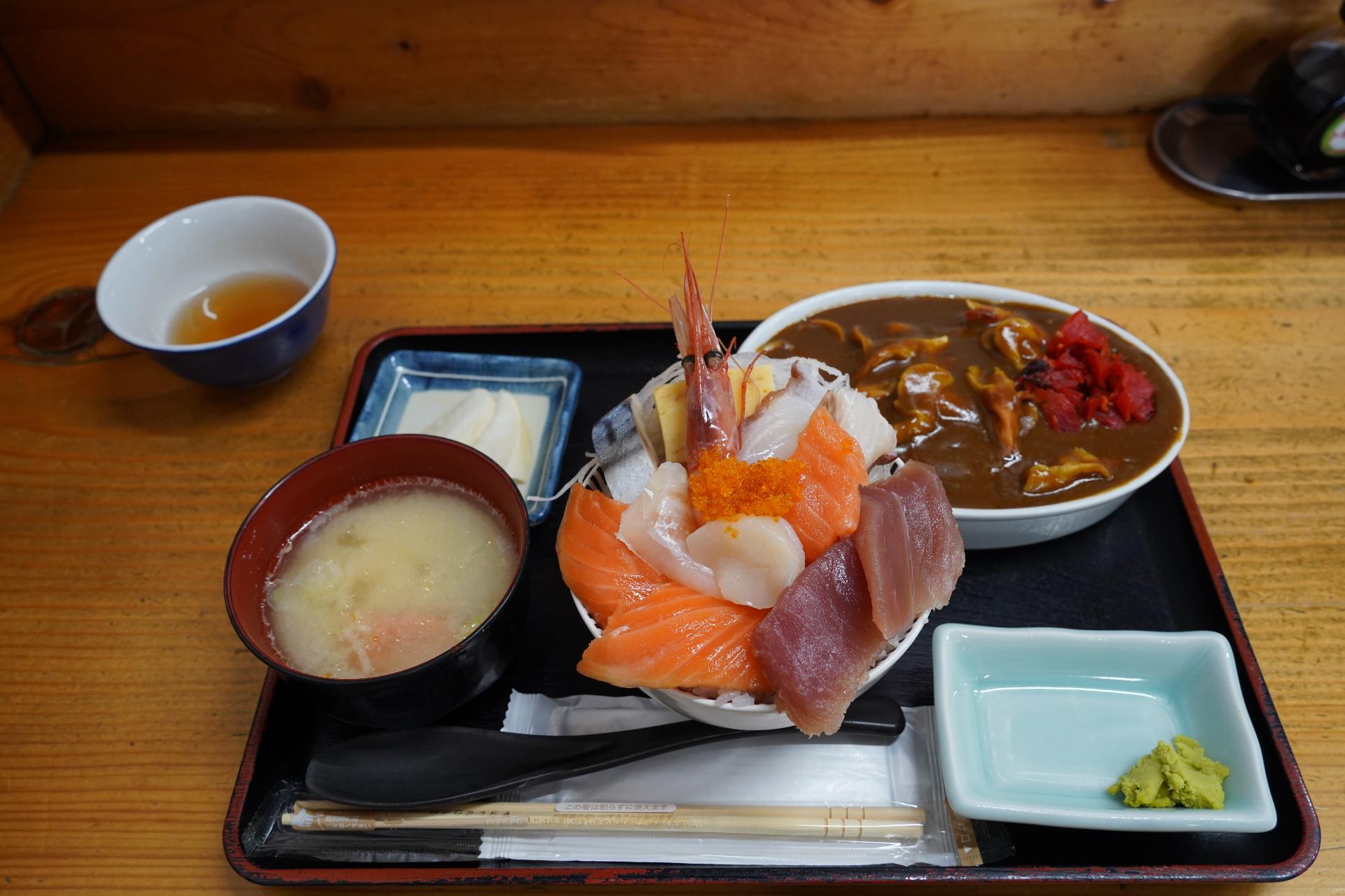 午餐來到漁港附近的『喰い処 弐七』,點了個可以同時吃到海鮮丼和當地特色北寄貝咖哩的ハーフ&ハーフ,分量相當足夠,而且只要¥2100
