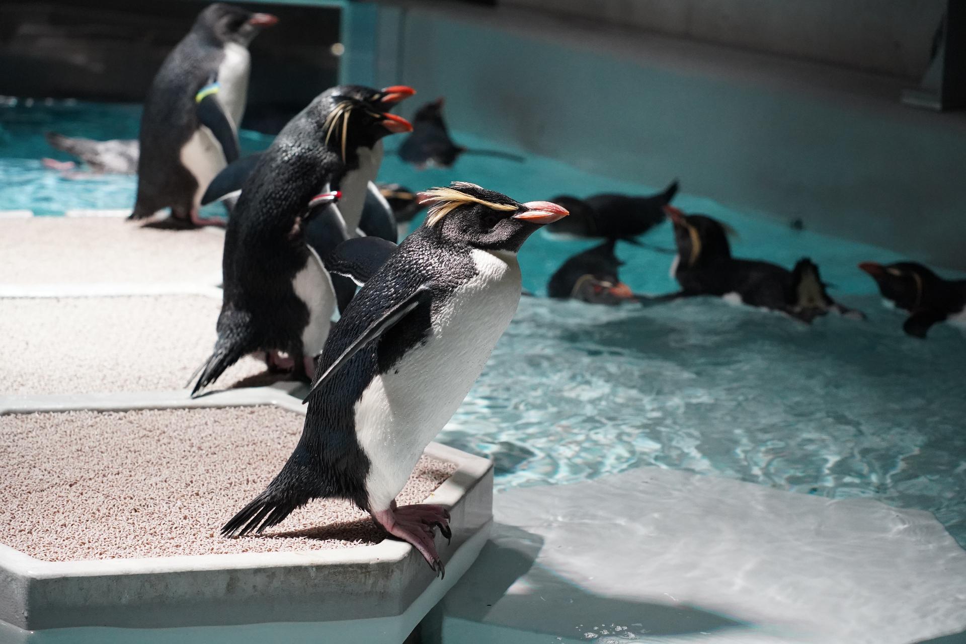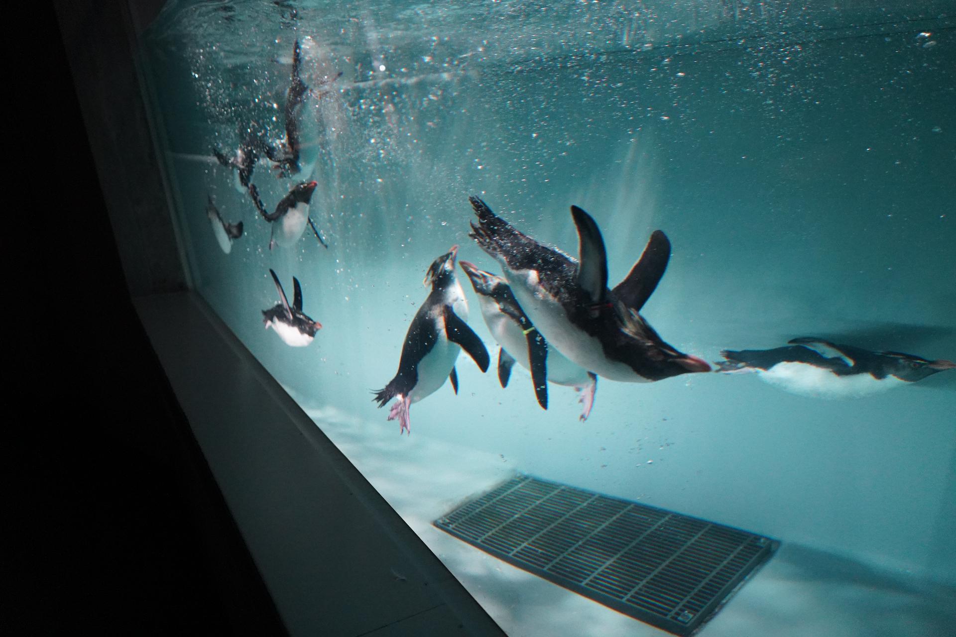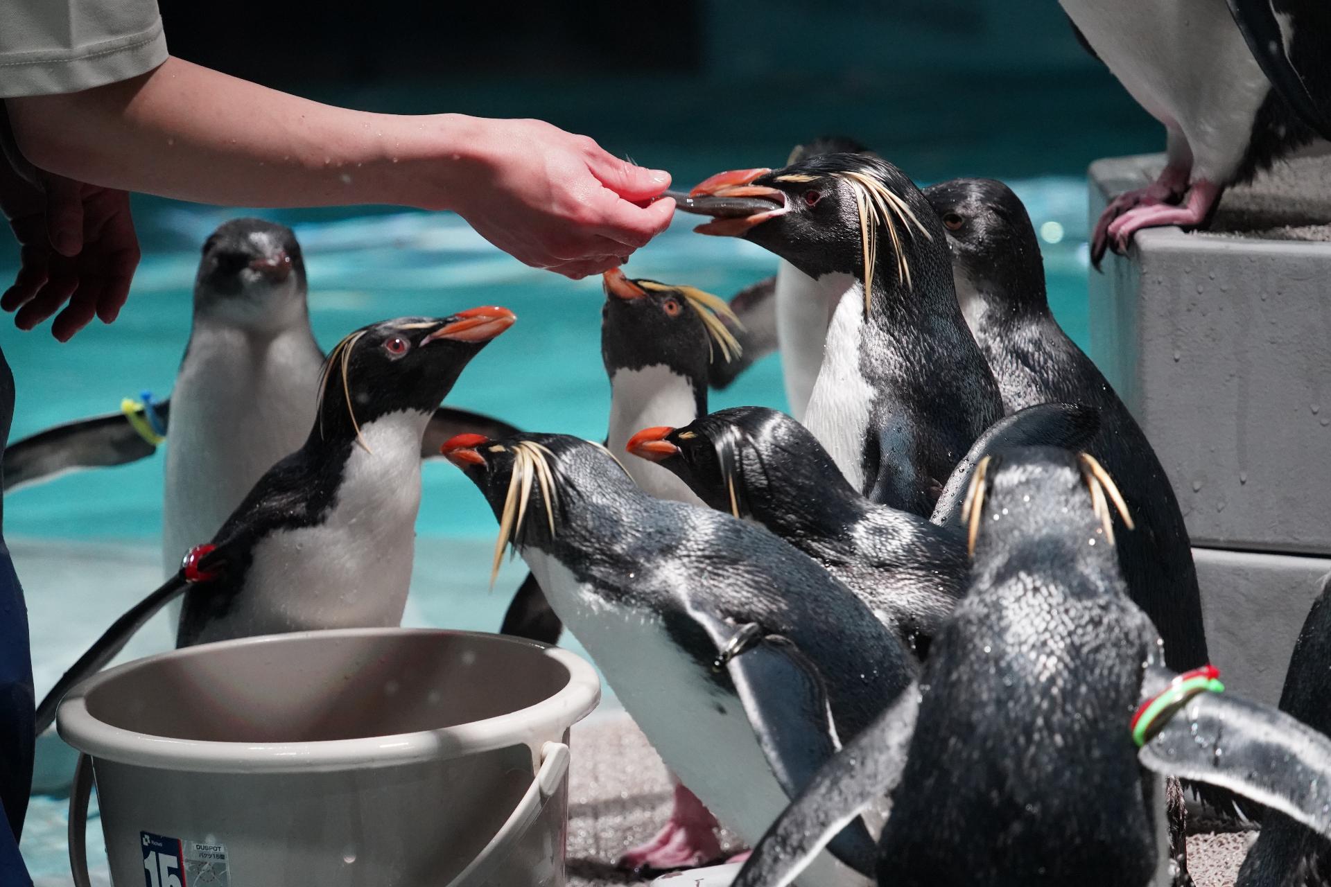 飼育員最後會直接把飼料丟到水裡,接著企鵝會一整群跳下來搶著吃