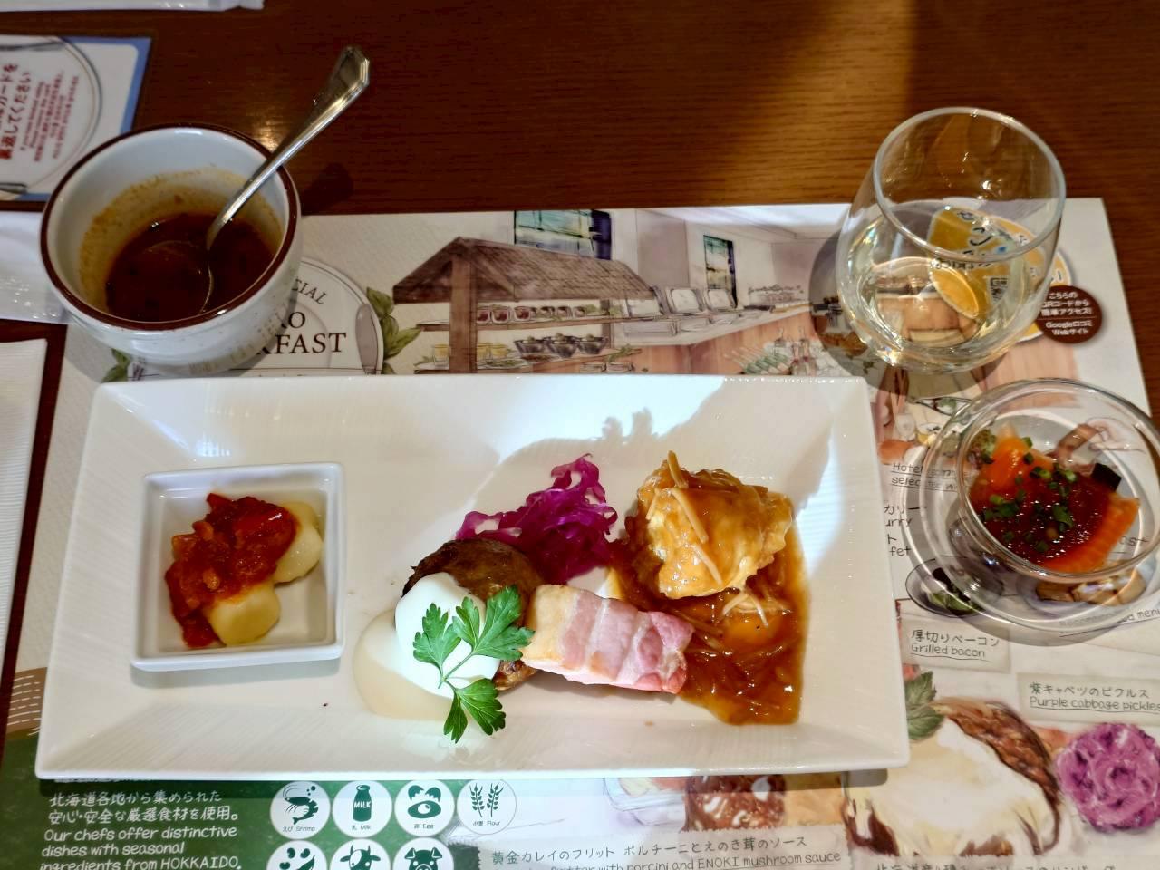 今天吃飯店的早餐,除了固定的主餐(白色那盤) 外,其他是自助式的,品項感覺上比小樽的少一點,不過主餐真的不錯,其他品項也不差