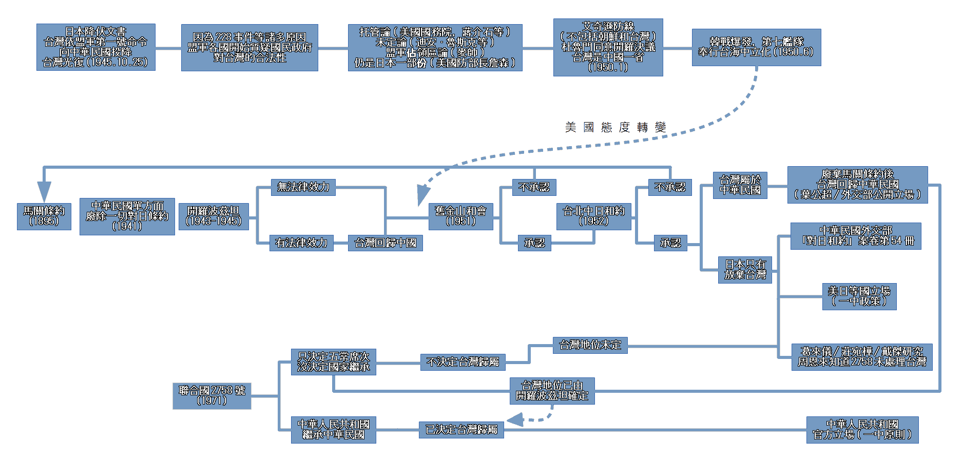 1951年舊金山和約之前,韓戰已經爆發,美國外交從「不干涉內戰,接受中國統治台灣」 轉向奉行「台海中立化」,第七艦隊將台海兩邊隔開,美國需要拉著小弟們鞏固目前的現狀。舊金山和約不只中共沒來,蘇聯,北韓,北越,蒙古國也沒來。
