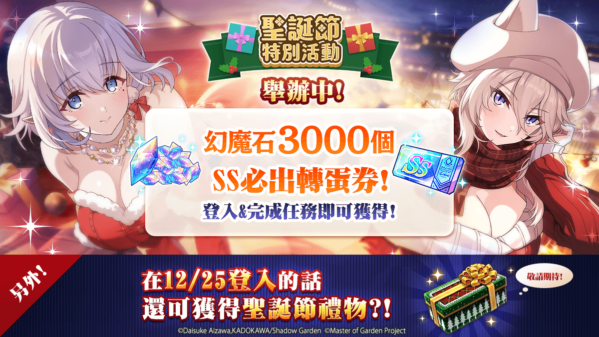 此外,宣布舉辦 2025 聖誕節特別活動,內容包含了 豪華登入獎勵、每日免費轉蛋、限時任務 以及 培育養成支援活動,於 12 月 25 日聖誕節當天登入可獲得 "聖誕節禮物"。