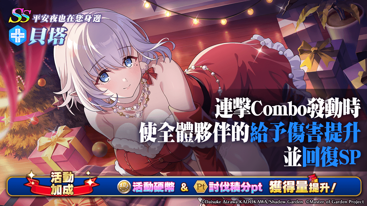 自 4 日(四)1 時(JST)推出的期間限定轉蛋角色【平安夜也在您身邊]】貝塔,是名當連擊 Combo 發動時會使全體夥伴的給予傷害提升並回復 SP 的藍屬性支援角色,搭配專屬魔道具「聖誕皮革精裝本」。