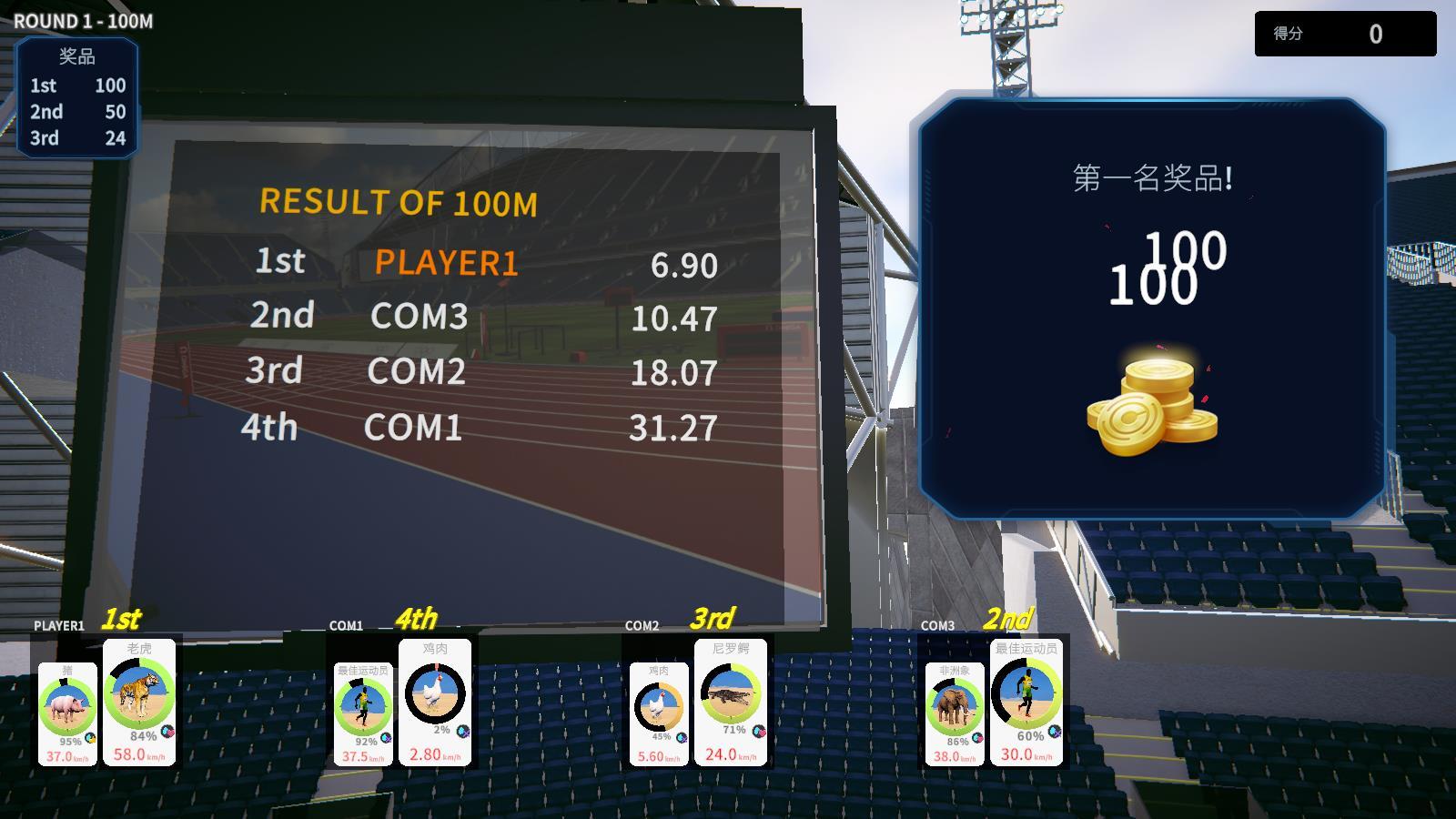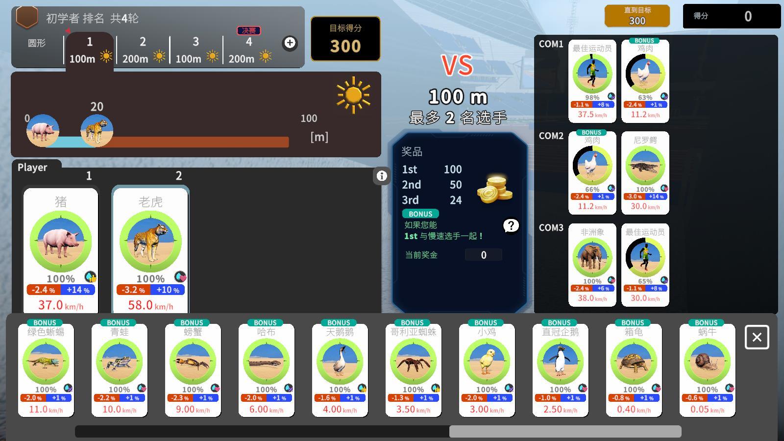 豬跑20公尺,老虎跑80公尺先贏第一場