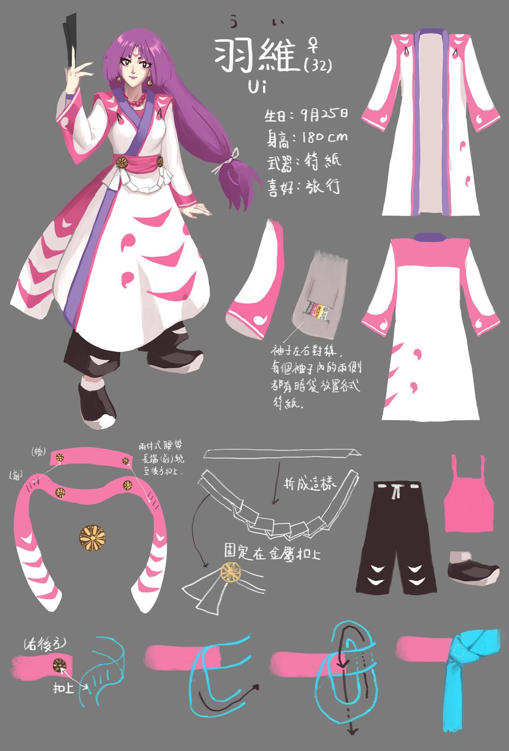 下面這張圖是草稿,而顏色本來是桃紅為主要底色,正好和最終版相反。她使用的呪具是符紙。符紙是一次性的,她會在袖子裡準備許多張,還有各種不同用途。雖然有用完的風險,但也因此讓呪術的力量得到大幅提升,算是一種制約。而且到目前為止,她似乎也從來沒有真正在戰鬥中陷入無呪具可用的窘境。