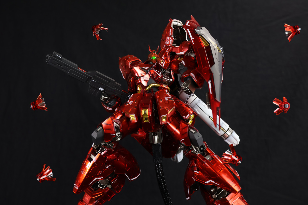 浮游感應炮在 RG 上不僅有做色差分色,也可以展開葉片,並推出砲口。另外加入的副廠背包改件,讓燃料管與浮游炮收納艙增加了展開機構,視覺張力大幅提升