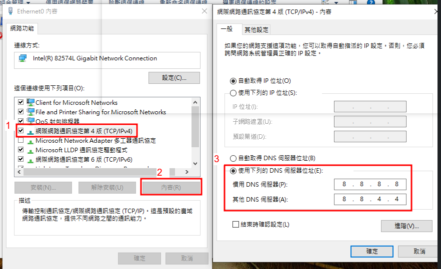 - 下方域名伺服器設定,個人是使用google的,至少設定兩個(第一順位DNS、第二順位DNS),避免系統去抓ISP業者提供的DNS伺服器