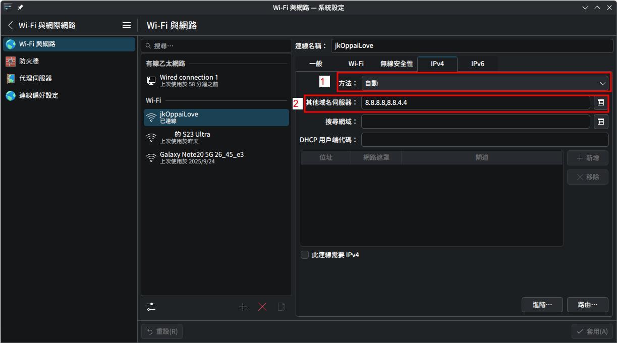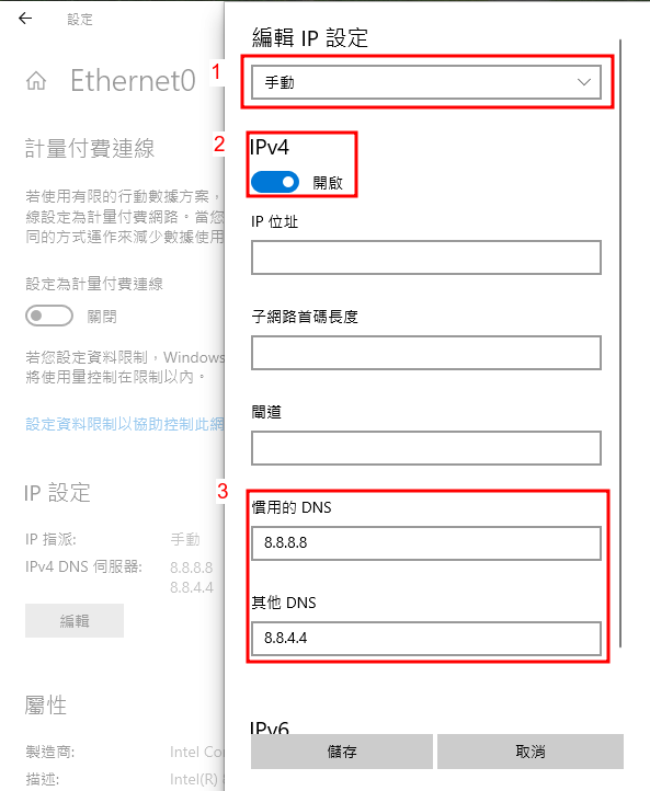- 在1的位置,修改為"自動(只有位置)",若是維持原先預設"自動",即便後續將DNS設定寫入,實際連線時也會失效