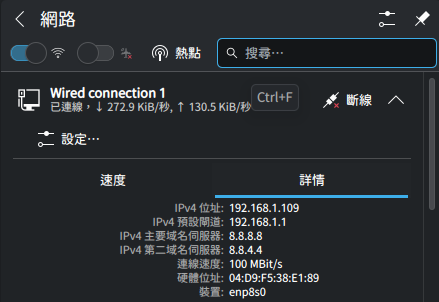 - 修改後,需要斷開網路並重新連線。重新連上後確認連線狀態,可以看到主要域名伺服器及第二域名伺服器已經套用設定,若第二域名伺服器非設定值,回到第一步確認是否有修改為"自動(只有位置)";只要有一個DNS是自動取得,就會看到封鎖畫面