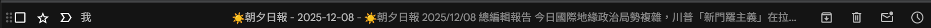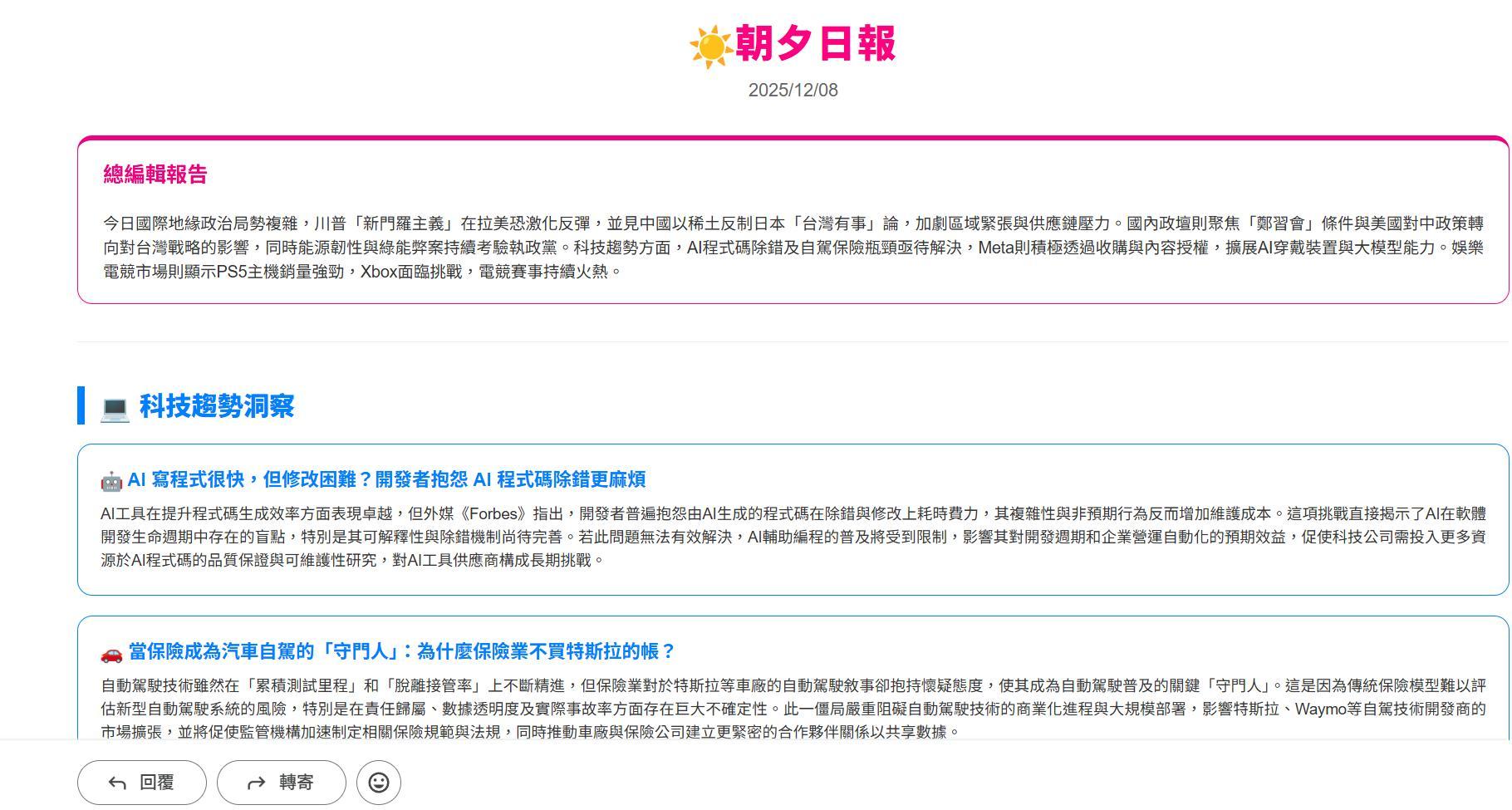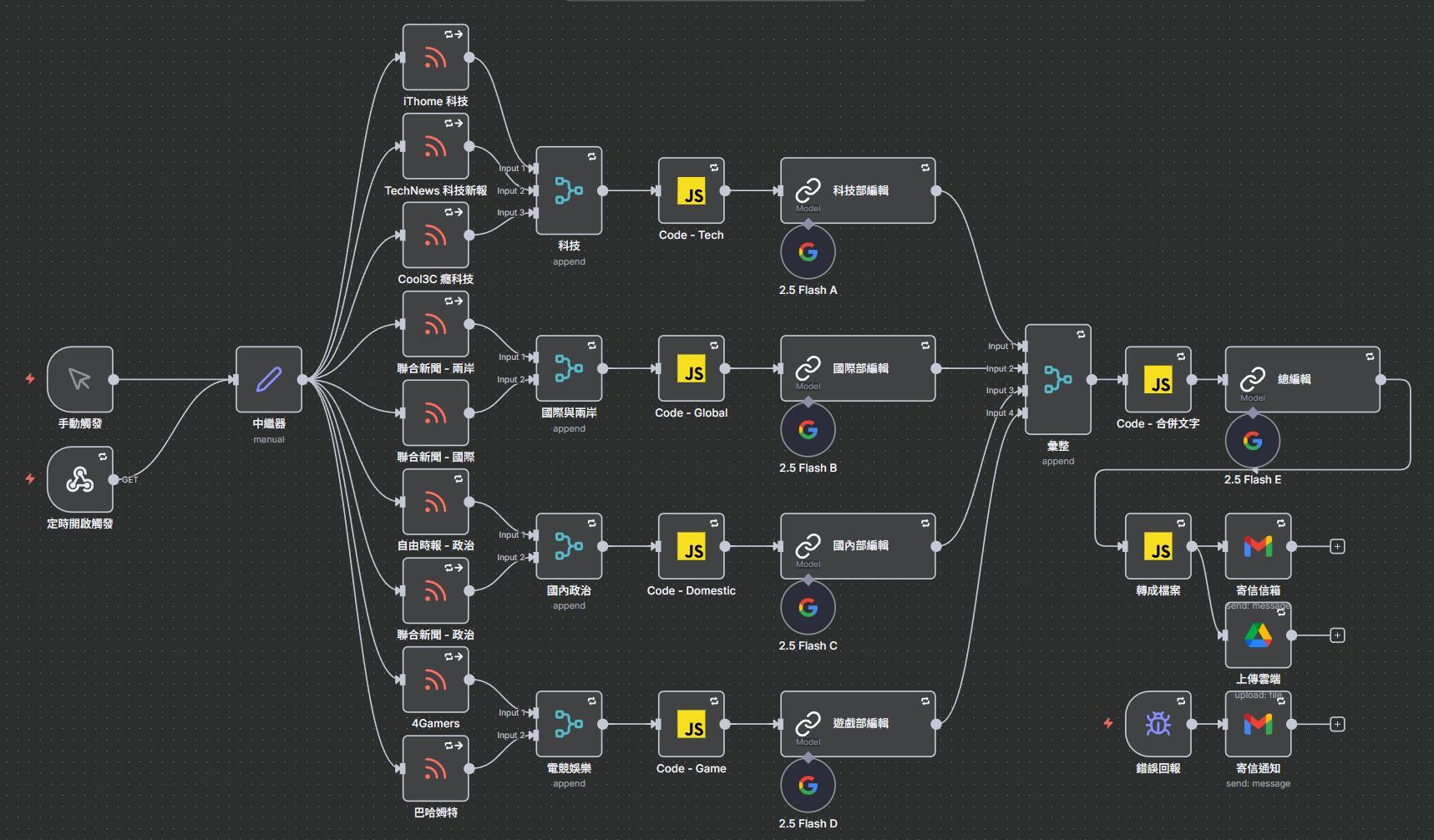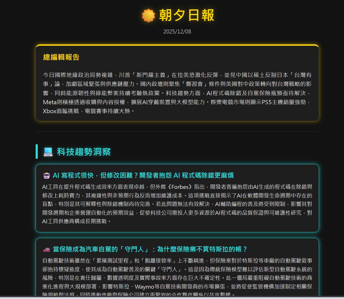 這幾天有空也可以來跟大家分享一下用n8n做的一個每天早上七點半自動爬取新聞rss然後經過語言模型的整理後製作成一份簡報給我的工作流,用到現在感覺是蠻穩定的(會自動寄信+上傳雲端,還有報錯通知),應該就截幾張圖給大家看看他做完後的報告長怎樣,我還特別搞css美觀那些的東西很久