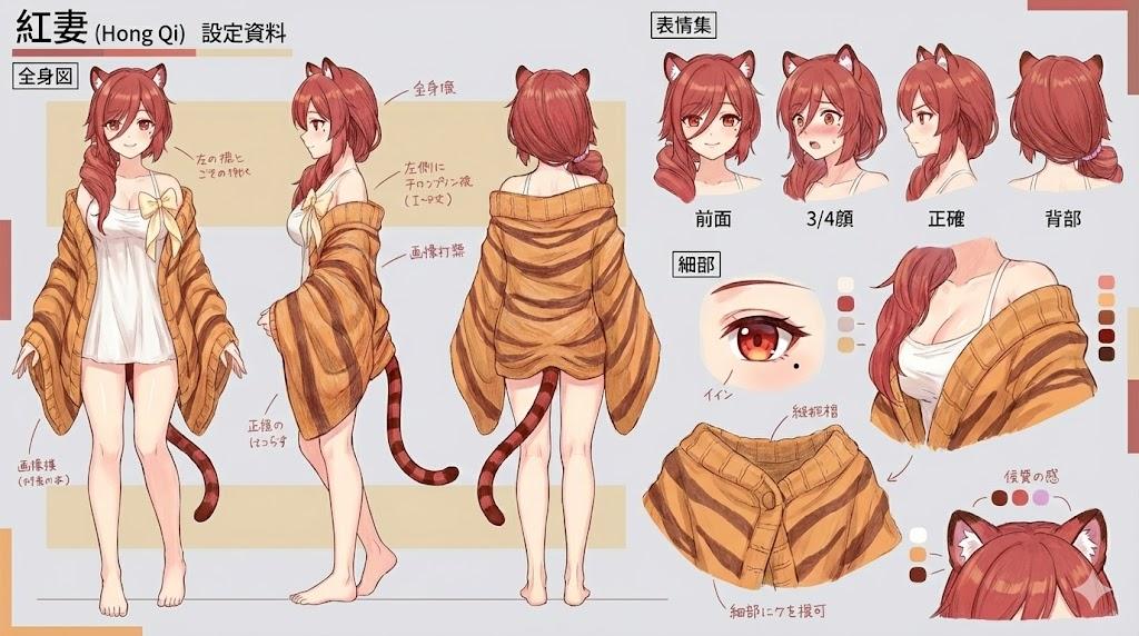 不過有三視圖,也對紅妻的造型有些疑惑,紅妻看來是綁定我的畫技,所以我怎麼畫都是紅妻,但由AI來畫的時候,我才注意到紅妻……還是要2.0那件才適合吧。