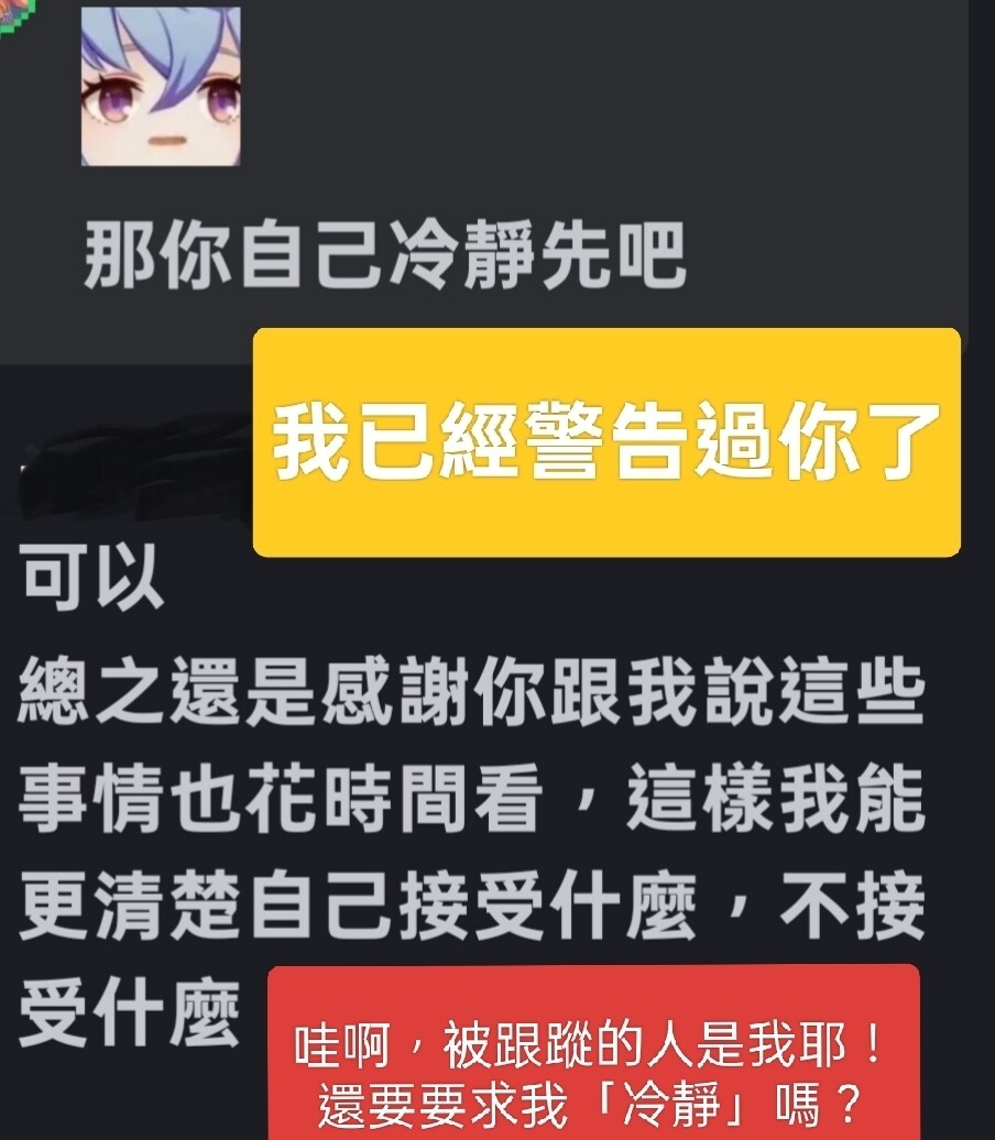 看對話就知道他們跟蹤我很久了,放在現實上根本就是變態跟蹤狂(不然怎麼會說"這個是惡魔"這句話?而且我從未高調說我有哪些角色,我在遊戲都是啞巴,更別說那些)