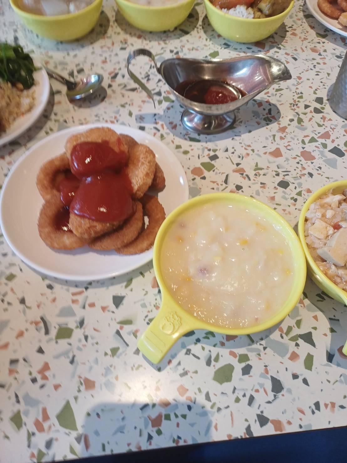 至炸物區去取些洋蔥圈以及雞塊,在配蕃茄醬去沾的炸物,口感來說算脆酥美味,玉米濃湯的濃稠感不錯,配玉米、馬鈴薯、火腿等料來喝,算是一道前菜不錯的湯品。